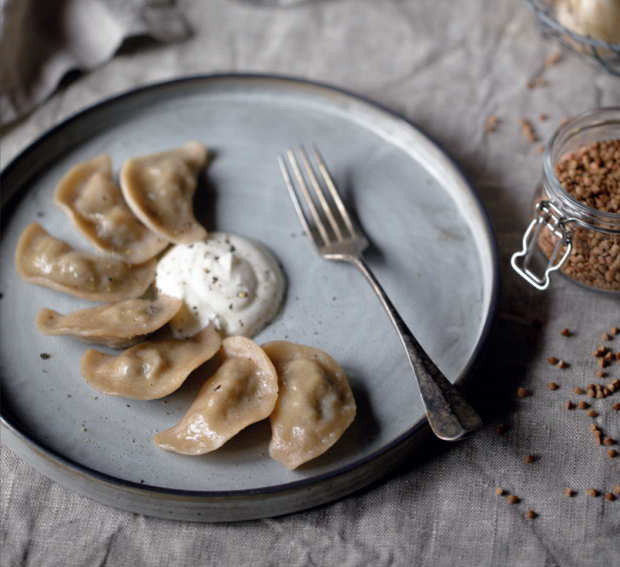 Очень простой и бюджетный вариант вареников, целиком построенный на сочетании русских вкусов. Гречневая мука придает вареникам бурый оттенок, тесто получается более плотное, чем обычное. В сезон грибы лучше использовать свежие лесные.