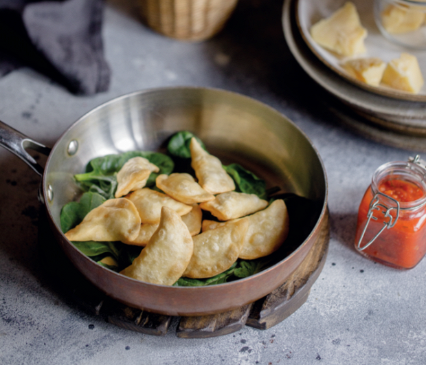 Хрустящие жаренные на сковороде вареники с картофельным пюре и нежным тягучим сулугуни скорее похожи на маленькие пирожки, и есть их советуем так же — руками.