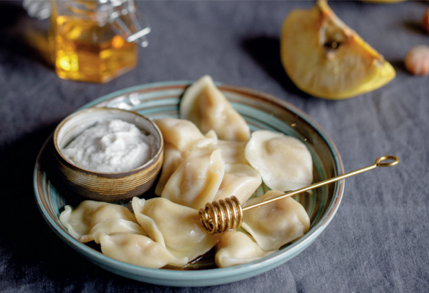 Тот случай, когда постное не означает скучное. Сладкие десертные вареники. Снаружи тонкое тесто, внутри начинка из айвы и изюма, растушенных в кокосовых сливках с медом. После термической обработки кислая и твердая айва становится сладковатой, мягкой и мясистой, а изюм вместе с медом отвечают за сахарные ноты.