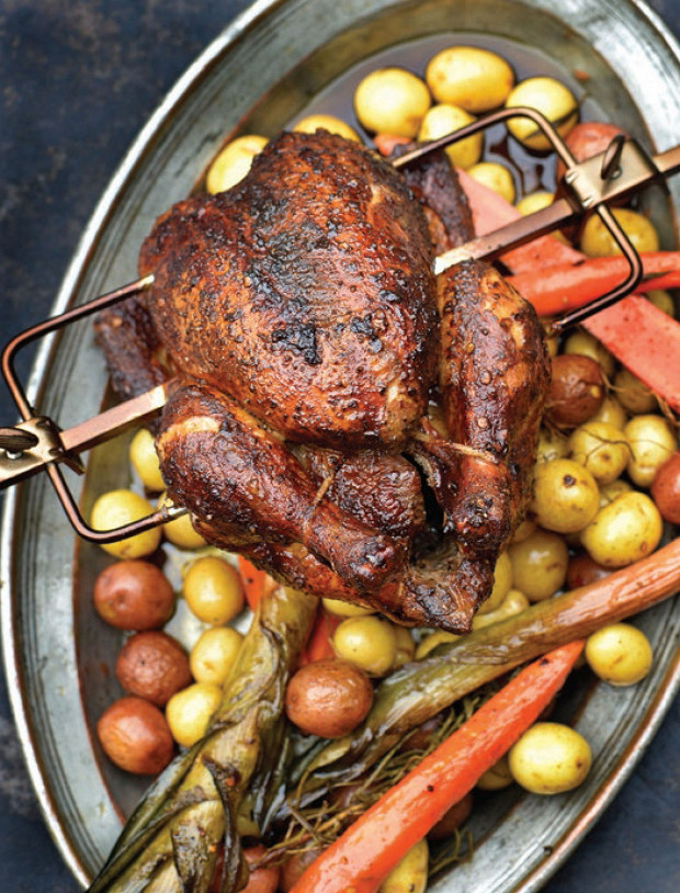«Лучший из известных мне способов приготовления курицы целиком — это жарка на вертеле. Или правильнее назвать это копчением? Блюдо, которое я вам предлагаю, взяло лучшее от двух этих способов — хрустящая кожица со специями, помогающая сохранить сочность мякоти, прекрасно сочетается с взрывной силой дымного вкуса. Самое простое — приготовить такую курицу в угольном гриле с откидной крышкой, оборудованном вертелом. В качестве альтернативы используйте стандартный угольный или газовый гриль с вертелом и одно из коптильных устройств».