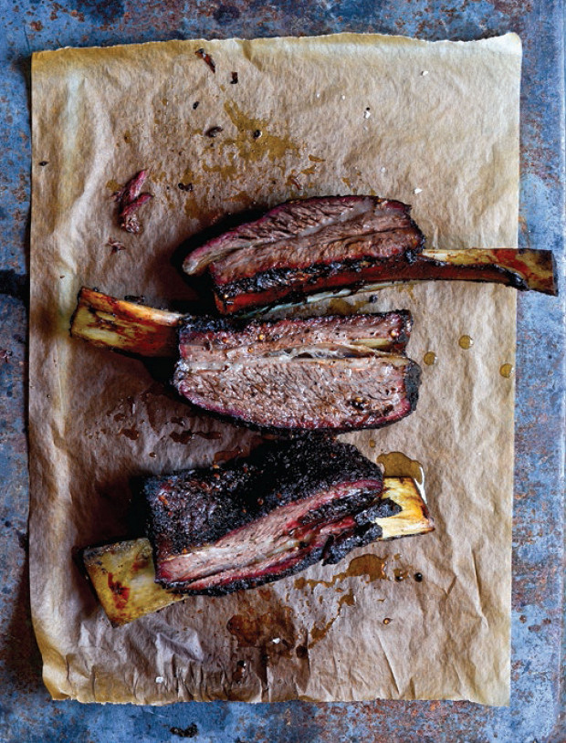 «Один из эпитетов для описания этих говяжьих ребер — огромные (другой, более спокойный вариант — грудинка на кости). Билли Дарни подает их в бруклинском Hometown Bar-B-Que, а Хью Мангум — в Mighty Quinn’s Barbeque в Нью-Йорке и Нью-Джерси. Готовят их и парни из Butcher and the Boar в Миннеаполисе. Совсем скоро и вы достанете эти пышущие жаром куски мяса из вашей коптильни. Насколько они большие? Каждая такая мясистая кость весит примерно килограмм. А приправы? Ничего лишнего: соль, черный и острый красный перец. Сконцентрируйтесь на мясе и дыме».