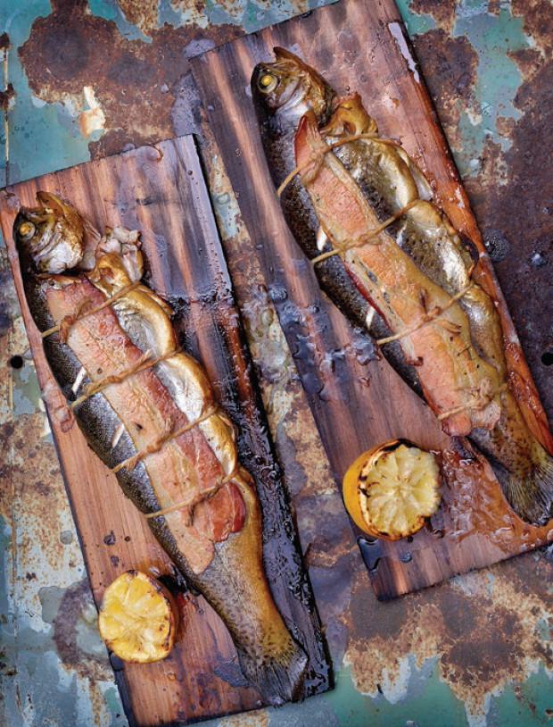 «Нежный вкус форели делает ее главным элементом мировой культуры копчения рыбы. При копчении форели мне нравится использовать популярную технику гриллинга — копчение на доске, или планкинг. Доска — ольховая, кедровая, из гикори, на ваш выбор — придает рыбе ярко выраженный древесный аромат, который легче дымного и отличается от него. Кроме того, рыбу на доске удобно сервировать, да и выглядит это очень красиво, вам даже не понадобится тарелка.