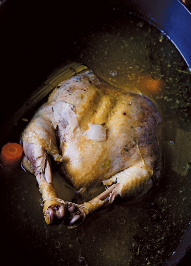 «Названия некоторых блюд звучат куда лучше на французском! Ну разве можно сравнить пуль-о-по (poule au pot) с какой-то скучной вареной курицей? Помню, как впервые приготовила такую курицу для мужа, когда мы еще жили в Париже. «А ее разве не надо предварительно хотя бы обжарить?» — спросил он. Я наградила Оддура уничтожающим взглядом — таким, какой в переводе не нуждается. Позднее тем же днем, когда он с аппетитом уминал курицу, он тоже наградил меня взглядом, который говорил: «Ты была права, а я ошибался». Очень люблю, когда на меня так смотрят! Теперь Оддуру настолько нравится это блюдо, что он просил передать, что фотография этой курицы — его самый любимый снимок во всей книжке. Пуль-о-по — национальное достояние Франции, и у каждого региона есть своя версия этого блюда. Этот рецепт — результат долгих экспериментов. Но базой для него послужил замечательный рецепт мамы моей подруги Флоранс, которая придумала тщательно натирать курицу под кожей специальной чесночной смесью. И пусть вас не смущает скромный внешний вид этой курицы — она и впрямь потрясающая».
