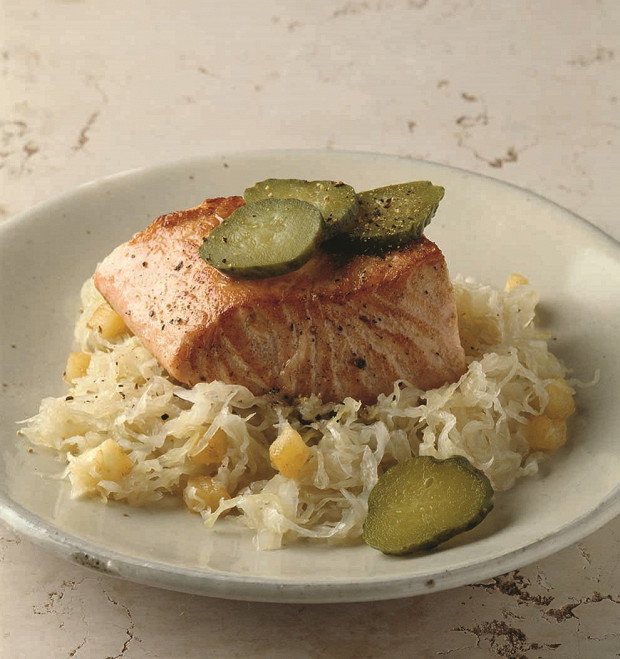 «Это старинный рецепт, классика эльзасской кухни. Шукрут с лососем готовили в постные дни и в период Великого поста. В слегка измененном виде (на фото один из вариантов) это блюдо до сих пор представлено в гастрономии Эльзаса».