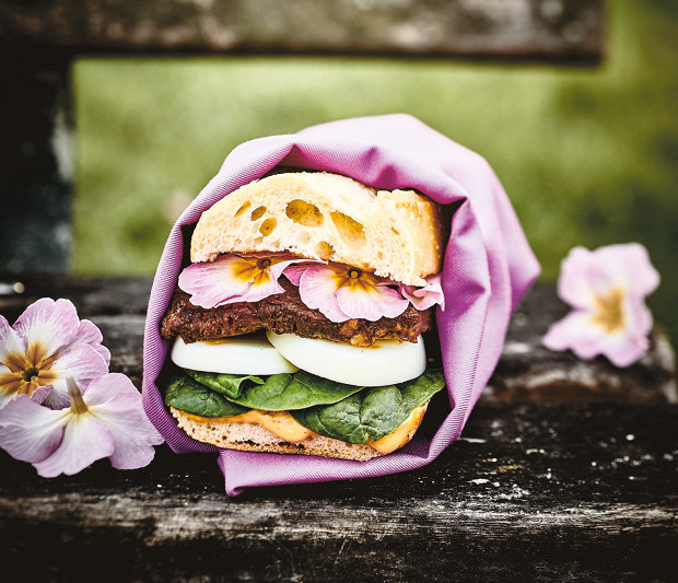 Один из самых красивых рецептов книги, в котором стейк стриплойн украшается съедобными цветами. В сэндвиче используется немало соусов и уксусов, поэтому ждите звонкости и остроты.
