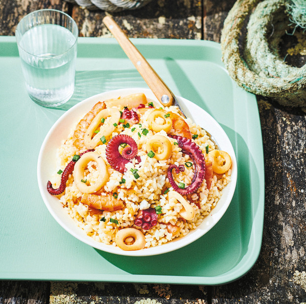 Вкусы и запахи моря и Японии, где рис сочетается со специями, креветками и двумя видами кальмаров. А по сути — сытная, душистая и густая каша, которая насытит на несколько часов. Креветкам полезно оставлять хвостики: при термической обработке они начинают отдавать отличный аромат.