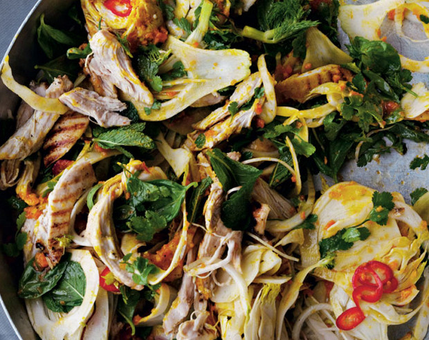 «Этот разноцветный салат, изумительно сочный и освежающий, придумали повара из ресторана «Оттоленги» в Белгравии, и он пользуется бешеным успехом. Секрет его в пюре из апельсина — замечательной основы для приготовления соусов, сальсы и начинки для пирогов. Если вы не любите фенхель, замените его смесью из зеленого лука и рукколы».