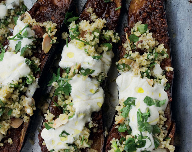 Чермула — острая североафриканская паста, которой обмазывают рыбу и овощи, чтобы придать им аромат консервированных лимонов, смешанных с острыми специями. В данном случае из баклажанов, обмазанных чермулой и политых холодным йогуртом, получается прекрасное первое блюдо. Подайте к нему сладко-соленый салат из булгура, и у вас будет непритязательный вегетарианский пир».