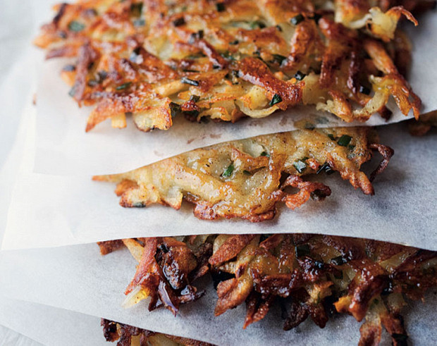 «Спасибо нашей подруге Хелен Гох, величайшей перфекционистке на свете, за то, что довела до совершенства это ханукальное блюдо ашкенази. Но не готовьте латкес только на праздник, они так хороши, что их можно предложить в начале любой еды или как гарнир к простому ростбифу. Латкес часто делают сладкими, в этом случае не добавляйте в них шнитт-лук и уменьшите количество соли. На стол подавайте теплыми со сметаной, посыпав мелким сахаром».