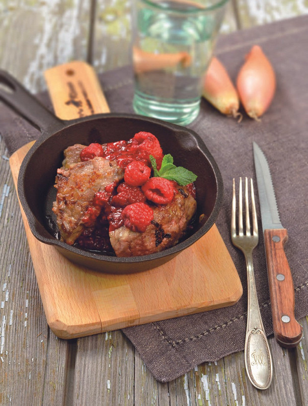 Телячья печень обжаривается на сковороде, а после соединяется с тушеной в сливочном масле малиной.