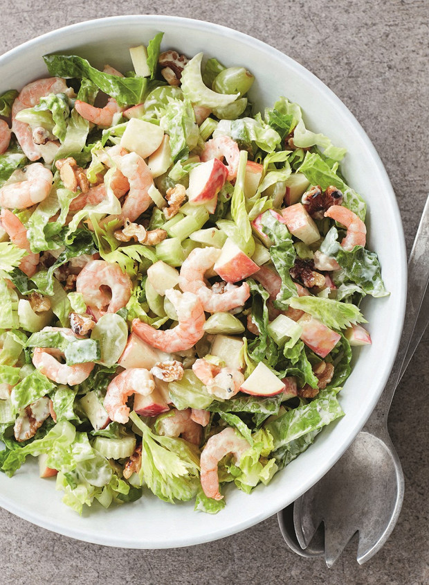 «Классический салат «Уолдорф» — это сочетание хрустящих яблок, винограда, сельдерея и грецких орехов. И все бы ничего, если бы не огромное количество майонеза в нем. В свой салат я добавляю креветки — источник белка, а калорийный майонез заменяю гораздо более легкой заправкой из греческого йогурта. Поэтому готовьте и ешьте салат «Уолдорф». Сердцевина черешкового сельдерея — это более нежная внутренняя часть стеблей, которую часто продают отдельно».