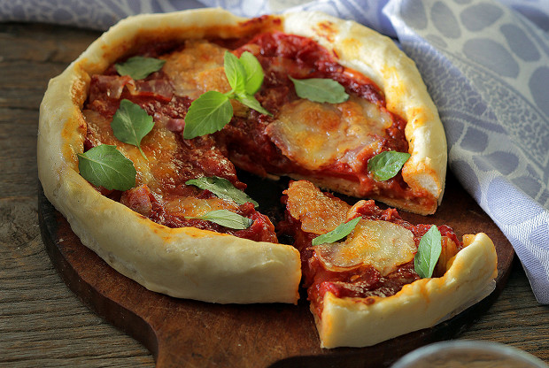 «Эта пицца больше похожа на пирог с сыром и толстым слоем томатного соуса, чем на привычную нам пиццу на тонком тесте. Она и выпекается не на камне, а в круглой форме с вертикальными бортиками высотой 2,3–3 см. Отличается и тесто: в него обязательно добавляют кукурузную муку тонкого помола и хорошую порцию сливочного масла. В результате получается тесто, больше похожее на рассыпчатое, чем на хлебное. Я добавила в начинку немного нарезанной тонкими ломтиками копченой грудинки, но и это не обязательно: хорошо пропеченное тесто, сыр и томатный соус создают вполне гармоничный вкус».