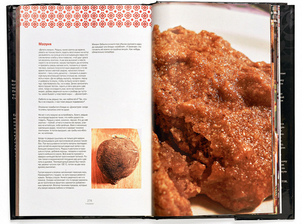 Сырников объездил весь Русский Север и северо-запад, клянчил у бабушек рецепты, которые сами бабушки последний раз использовали чуть ли в девичестве, а потом описывал свои кулинарные опыты на страничке в Livejournal.com и на сайте syrnikov.ru. Собственно, книга — сумма этих опытов, перенесенная с электронных носителей на бумажный. Со всеми неизбежными издержками процесса: любительские картинки растянуты на полосу и презирают традиционные полиграфические представления о глубине резкости и о законах цветоделения. Повествование фрагментарно, и единым целым его делают только тема — русская кухня, бурая тональность изображений и сентиментально восторженный тон рассказчика.