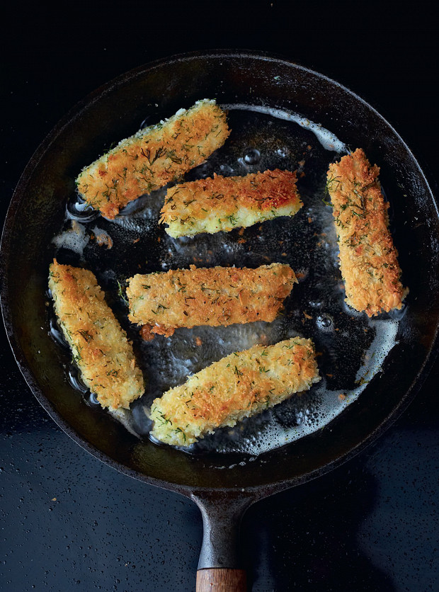 «Я вырос на белой рыбе, такой как треска, но не менее замечательная рыба и сайда, из нее получаются превосходные рыбные палочки по моему рецепту. Я использую в данном случае панировочные сухари панко — более воздушные, создающие не такую тяжелую корочку на продуктах после обжарки, которая зато дольше остается хрустящей. Сочетание сухарей с укропом придает рыбным палочкам удивительный аромат и прекрасный внешний вид. Дайте мне такую рыбу и бутер с жареной картошкой, и мне как будто снова девять лет».