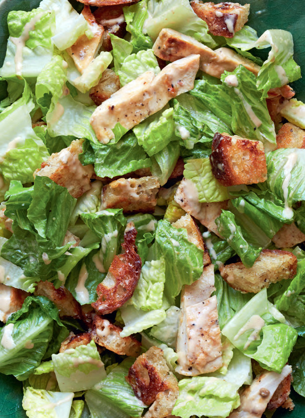 «Салат «Цезарь» в нашем доме — неизменный фаворит, но, учитывая количество едоков, мне всегда приходится готовить его в огромных количествах. Сделать салат более питательным очень просто, если добавить к нему быстро поджаренную на гриле куриную грудку. Прежде чем добавлять в салат крутоны, обмакните их в заправку — это создаст дополнительный взрыв вкуса».