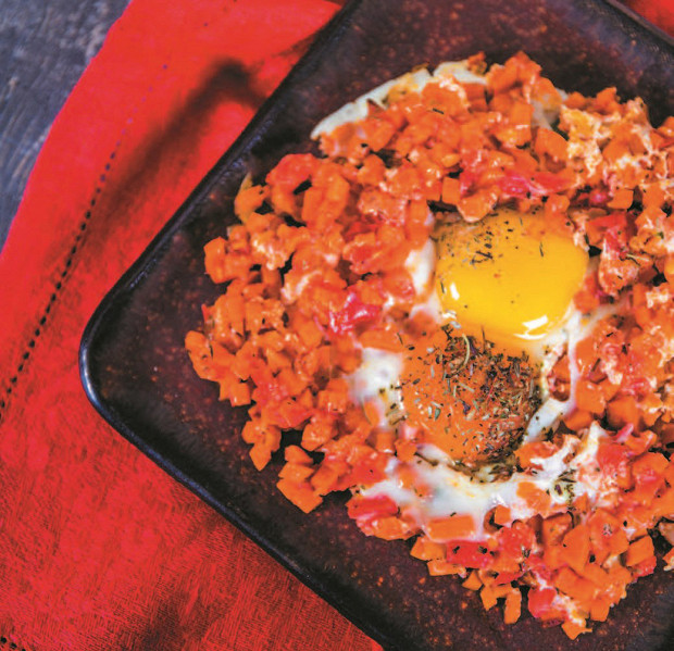 Из-за своей сладости батат здорово сочетается с чем-то совсем не сладким — в нашем случае это яйцо, оливковое масло, лук, прованские травы, помидор и соль с перцем.