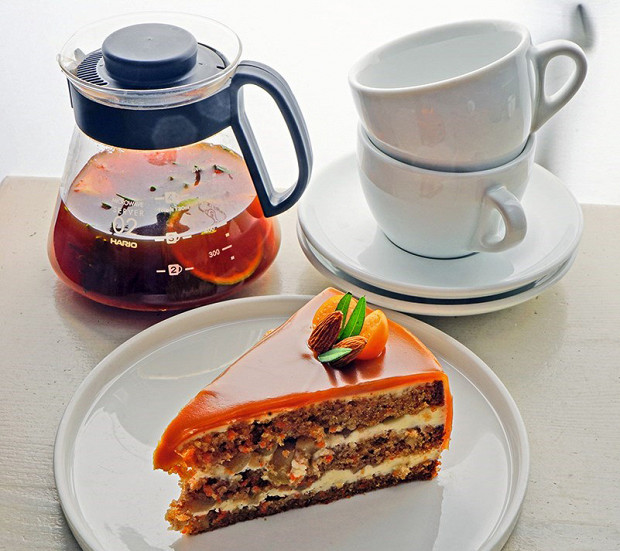 Рецепт из кофейни Bunabuna (Тверь). Классический рецепт с новыми подробностями. В сочный текстурный бисквит добавили миндаль, а в начинку из сырного крема — крупные кусочки груш. Сверху торт покрывает слой соленой карамели — идеальное сочетание вкусов на тарелке.