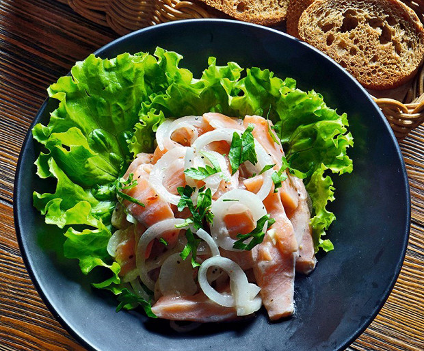 Очень быстрый способ обращения с лососем. Нарежьте рыбу и маринуйте в смеси уксуса и оливкового масла в течение 5–8 минут. Рецепт из бара Budweis (Тверь).