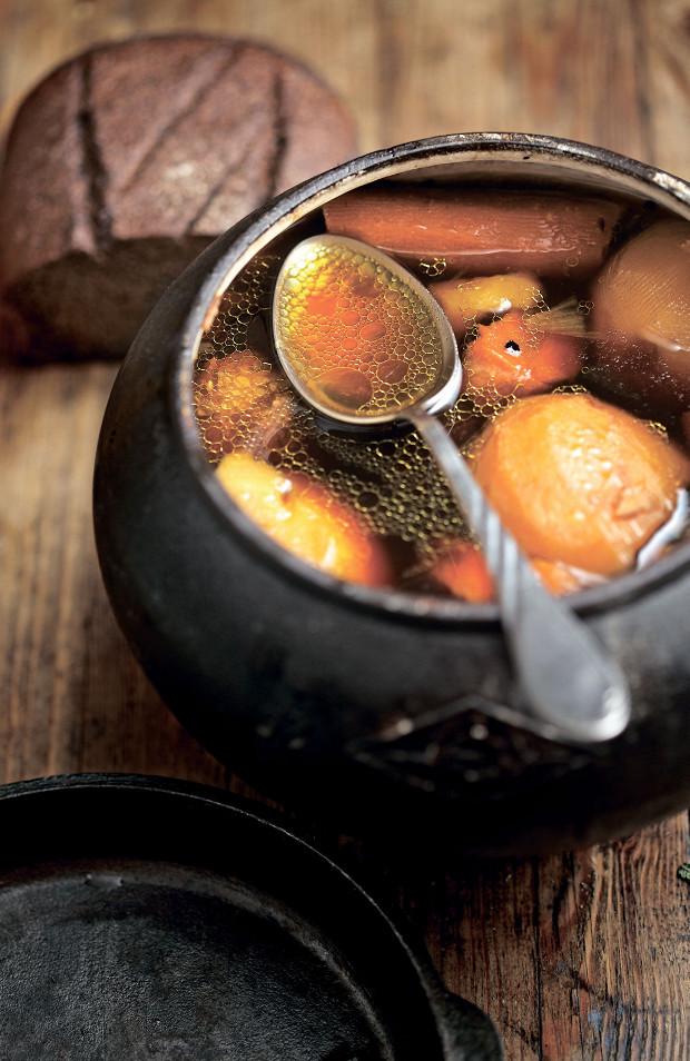 Первый том был посвящен закускам, припасам, пельменям, грибам и блинам. Второй том посвящен супам всех мастей и горячим блюдам из птицы, рыбы и мяса. Мы публикуем три рецепта из него с подробными авторскими комментариями: рахмановские щи с рыбой, ушное (от слова «уха») из баранины и рыбный суп щучина.