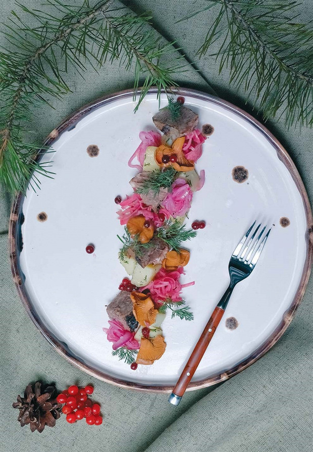 Этот салат для меня олицетворяет историю и культурные традиции народов Северного Урала. Мы используем мокрый посол, потому что он имеет некоторые преимущества перед сухим. При мокром посоле соль проникает в мясо быстрее и распределяется равномерно, продукт получается нежным и умеренно соленым (в отличие от сухого, где мясо сильно обезвоживается, становясь сухим и жестким). Кроме того, солевой раствор проще насытить специями».