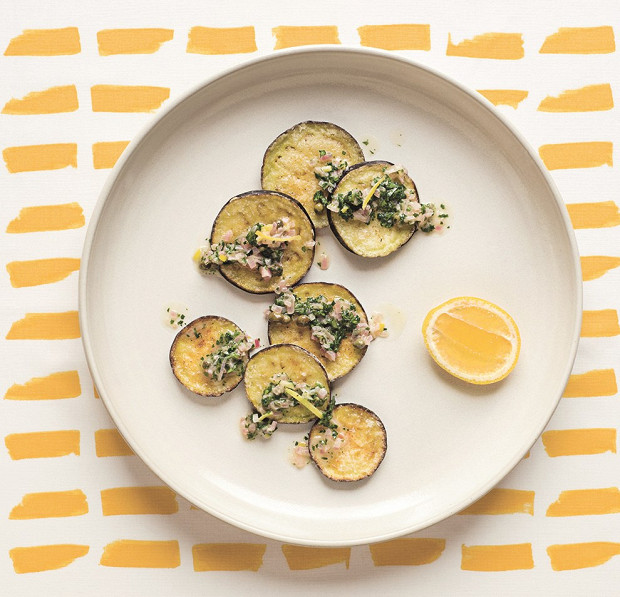 Мы публикуем три (на самом деле шесть: не только соус, но и блюдо) рецепта из этой книги: хрустящие баклажаны с соусом из лука-шалота, фрикадельки с нью-йоркским уличным соусом и лимонно-имбирный поссет с компотом из голубики и лимона.