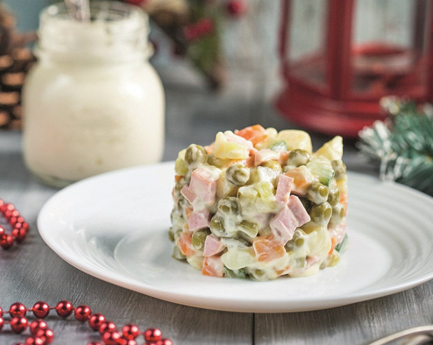 «В России это, пожалуй, самый праздничный салат, главный гость новогоднего застолья, его готовят на дни рождения и годовщины свадеб. Никакие, даже самые серьезные основания — вы веган, у вас аллергия на лактозу или яичный белок, вы соблюдаете Рождественский пост, — не могут быть причиной отказа от приготовления этого блюда. Большая часть ингредиентов оливье растительного происхождения, так что вам не придется сильно напрягаться, чтобы сделать веганскую версию салата. Вместо отварного яйца добавляем кусочки тофу, от докторской колбасы отказываемся вовсе или заменяем ее постными сосисками из пшеничного протеина, которые можно заказать в интернете или купить в специализированном магазине. Майонез тоже делаем веганский. Совсем немного усилий — и на сто процентов постный оливье уже в центре стола».