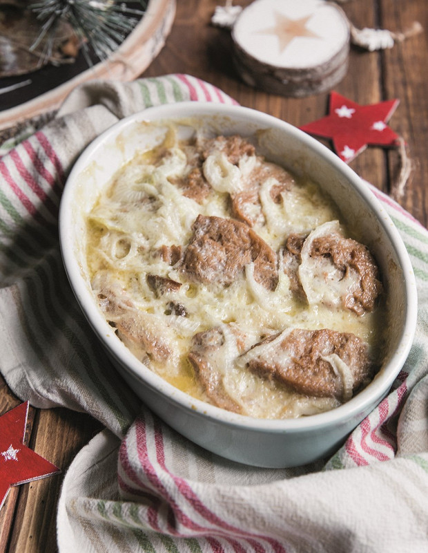 «В советские времена мясо по-французски было непременным атрибутом новогоднего стола. Во многих семьях традиция сохранилась и поныне. Если честно, я это блюдо так обожаю, что могу есть в любое время года, даже летом. Оно, конечно, довольно жирное, но фантастически вкусное. Кстати, веганский вариант мясоеды уплетают за обе щеки, даже не подозревая, что в нем нет ни грамма продуктов животного происхождения... Готовить «мясо» по-французски я рекомендую в красивой керамической форме для запекания и в ней же подавать блюдо к столу».