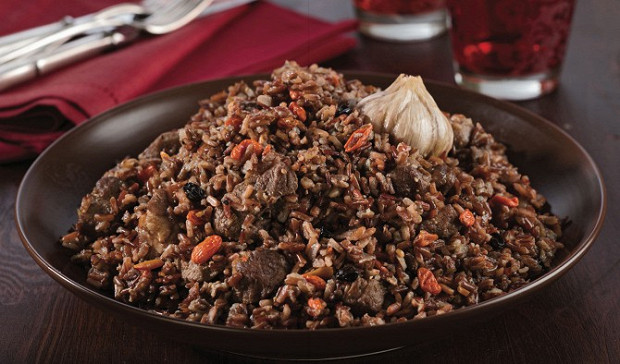 Ягодам годжи приписывают свойства едва ли не регенерационные. Но в этом плове достаточно их вкусовых характеристик: их терпкая кислинка играет совместно с барбарисовой.