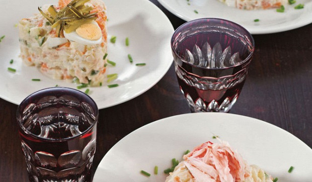 Овощи Алена рекомендует не переваривать: они должны быть аль-денте. За легкую кислинку на общем сладковатом фоне (маринованные огурцы в оливье Долецкой тоже сладкие) здесь отвечают антоновские яблоки. Для каждого гостя Алена советует оформить салат по-своему: кому кубиком, кому столбиком, а кому и просто горкой.