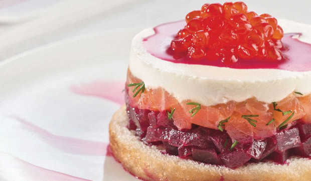 Сладость свеклы и акациевого меда в этом тартаре уравновешена нежной слабосольностью форели и икры, сливочностью «филадельфии» и лимонным соком.