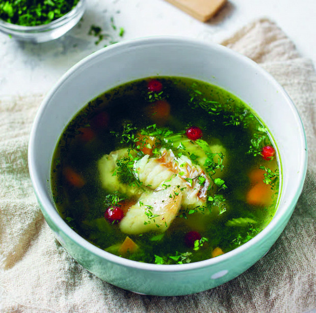 Несложный и впрямь легкий суп из минтая и зелени, в который закрались удивительные для него вещи: тут есть брусника и кориандр.
