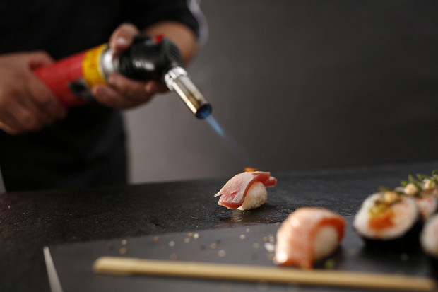 Собственно, горелка нужна, чтобы получить реакцию Майяра контролируемым способом, другими словами, сплавить в корочку белки и сахара при помощи сильного нагрева, не травмируя продукта. Как это работает, легко понять на примере модного японского блюда татаки, слегка подпаленных огнем брусочков тунца или говядины, вся прелесть которых — в контрасте между сырым нутром и обожженной корочкой. Возить их по сковороде и тыкать вилкой — только портить, они скукожатся, раскрошатся и потеряют товарный вид. А тут прошелся горелкой — и вжик, реакция пошла, поверхность подпалилась, а внутри все сыро и свежо. Тот же трюк можно провернуть с суши: готовый ролл или суши в духовку запихнуть затруднительно, зато можно горелкой подпалить кусок рыбы, оставив нетронутым рис и всю прочую начинку.
