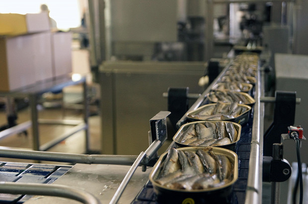 На соседней линии пустые банки катаются на американских горках конвейера, принимают в себя части сардинелл. Затем специальная женщина взвешивает банки — и добавляет в них или отнимает из них кусочки рыбы, чтобы везде было поровну. Дальше опять карусель конвейера, заливка маслом, закатка — и банки заполняют большие кубический контейнеры, в которых отправляются в автоклав.