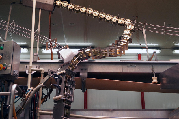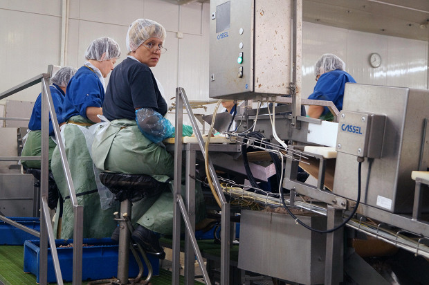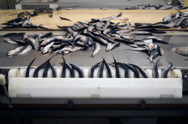 Размороженная салака сыплется на конвейерную ленту и движется дальше — туда, где ее поджидают сидящие женщины. Они сдвигают себе на рабочие поверхности гурьбы рыб и одну за одной вставляют салак в белые пластиковые ячейки головами вниз. Ряды ячеек устроены так, что, когда женщины вставляют в боковые отверстия металлические прутья, те проходят насквозь ровно через рыбьи глаза. Это занимает минуту; затем взмах руки — и прут отправляется на верхний конвейер, где уже едут к коптильне, покачиваясь, другие сотни салак. Потом другие женщины уложат салаку вручную в банки и превратят ее в крупные шпроты.