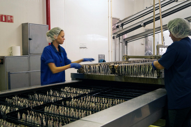 Называется он «Роскон», находится на окраине города Пионерского, равно промышленного и курортного. Построили его восемь лет назад, заполнив новейшим европейским и российским оборудованием. Завод гигантский. Может, это не так ощущается внутри — ну завод и завод. Но в месяц тут могут выпускать по восемь миллионов банок, а было такое, что выходило и девять. В год в среднем — 70–75 миллионов: пеламида, судак, сардинелла, скумбрия, сайра, ставрида, сардина и так далее — под маркой «Рыбное меню».