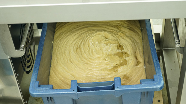 После этого яблоки отправляются на участок протирки. Большая итальянская протирка занимает половину комнаты и способна переработать в час от трех до пяти тонн сырья. Плоды сгружают в специальный накопитель, откуда они проходят через большой вращающийся шнек и попадают в бункер протирочного модуля: жмых улетает в одну сторону, а пюре сливается в специальный чан. Жмыха этого оказывается очень мало, всего 4% от массы яблок. Его на фабрике прессуют и отправляют на комбикорм.