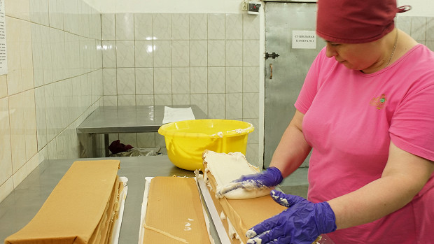 Режется пастила большим ножом на глаз, и каждый раз выходит ровно 120 грамм — или с небольшим допуском в плюс. Обрезки пускают на хрустилу или измельчают и в небольшом количестве добавляют в склеивающую массу, но только строго сорт к сорту. В соседней и последней комнате на посту стоит улыбчивая сотрудница с тазом, полным сахарной пудры. Кусок пастилы обваливается в пудре и тут же отправляется на соседний стол на упаковку.
