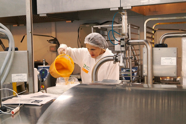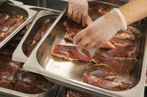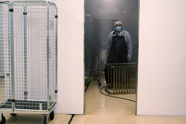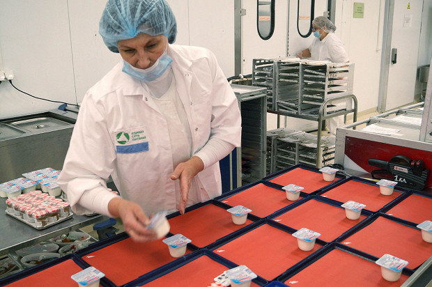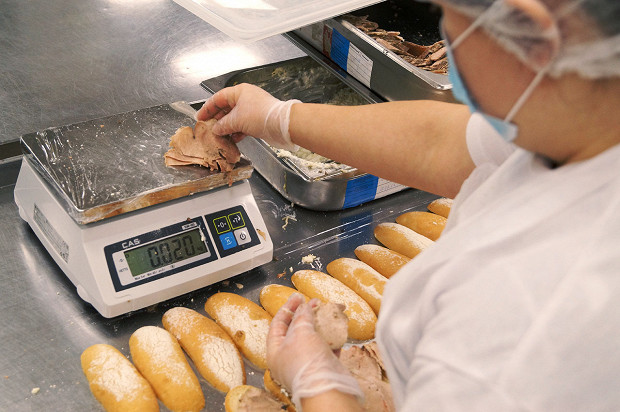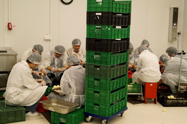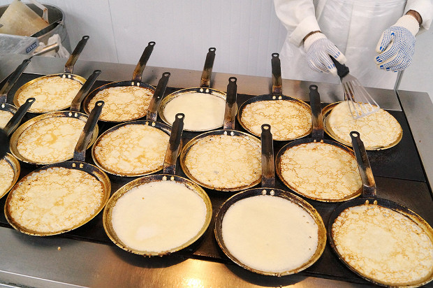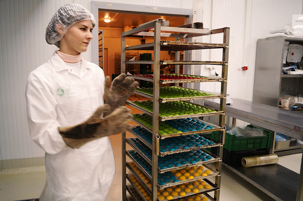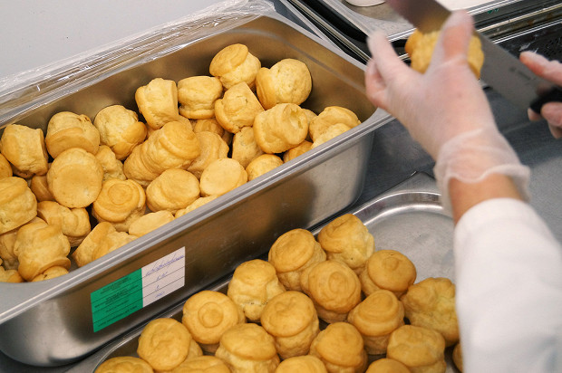 Да, это огромная фабрика-кухня. Она находится под Петербургом, в поселке Металлострой, совсем рядом с депо, где спят и ремонтируются «Сапсаны», — чисто логистическое удобство. Масштабы производства, по которому меня водит Фредерик Эннен, бренд-шеф компании RBE, которой все это принадлежит, впечатляют. Но это не конвейер. И потому, что выглядит все не как завод, а скорее как конгломерат больших кухонь. И потому, что тут очень много ручного труда. Вручную делают мини-багеты для сэндвичей экономкласса. Вручную пекут блины (1200 за смену один человек, представьте себе) и оладьи (примерно столько же). Чистят картофель и лук, маринуют утиные грудки, сворачивают рулеты из свиной вырезки, формируют пирожные макарон, нарезают лосося, украшают розмарином мясные рулеты, делают медовики, укладывают начинки в бутерброды — все вручную.