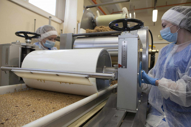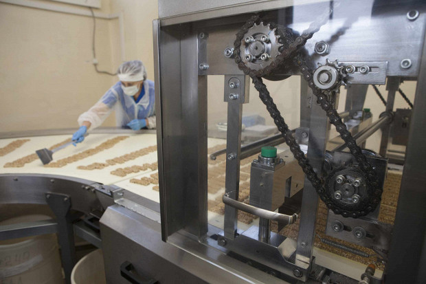 Цех производства мюсли — просторное белое помещение, середину которого занимает гигантских размеров громкая, ритмично работающая металлическая конструкция. Это — полностью механизированная линия, она ежедневно выдает до 200 000 тысяч злаковых батончиков. В цехе трудятся 20 человек — ровно столько людей нужно, чтобы помочь этой машине справиться с центнерами злаков, которые за час проходят путь от синей пластиковой бочки до готового батончика в шуршащей обертке.
