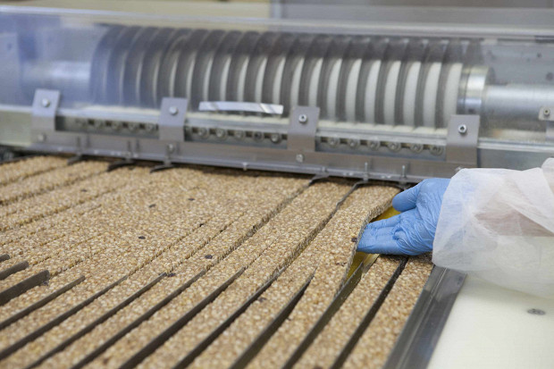 Перед тем, как разрезать пласт, его необходимо остудить — для это он проходит через охлаждающий тоннель. Проведя в нем 10 минут, злаковая масса выплывает из него и отправляется на автоматическую резку. Сначала из полотна получаются длинные узкие полоски, а затем они режутся на брусочки длиной от 10 до 11 сантиметров. Этот этап контролируется человеком: из каждого третьего ряда берутся для контроля один-два батончика и взвешиваются — каждый должен весить 24 грамма.