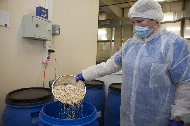Следующий этап — сбор сухой смеси, основы батончика. Она собирается вручную, каждый ее ингредиент хранится в отдельной емкости: пшеница, кукуруза, рожь, рис, ячмень, сушеные яблоки, изюм, корица, экстракт зеленого кофе и лимонная кислота, выполняющая роль консерванта. Ингредиенты отвешивают в нужных пропорциях и просеивают сквозь большое сито, на дне которого находится магнит — он нужен для того, чтобы отловить металлические элементы, которые, не дай бог, попали в отдельные компоненты. Затем все перемешивается в 250-литровом миксере, а дальше люди отходят на второй план и начинается работа механизированной линии.