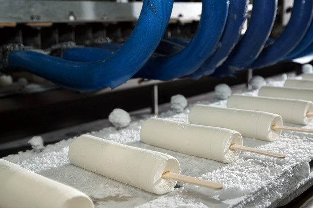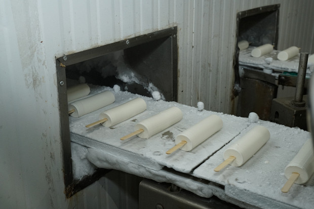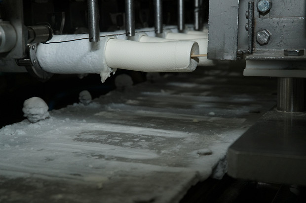 Теперь кремообразное мороженое по трубам отправляется на формовку. За форму мороженого отвечает горизонтальный экструдер: мороженое пулей вылетает из трубы, тут же делится на брусочки, в которые на большой скорости вонзается березовая палочка. Эскимо практически готово. Оно укладывается на нержавеющие пластины, которые конвейер отправляет в камеру быстрого замораживания.