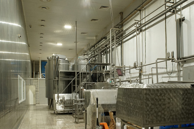 Мы переходим в соседний цех, опутанный трубами разных форм и размеров. По ним в разном направлении перемещаются молоко, смесь для пломбира и уже готовый пломбир. Посреди цеха стоят гигантские чаны-танки, в которых уже гомогенная смесь вступает в этап созревания. Созревание — это когда пломбир отдыхает и обретает характер: белки набухают, а стабилизатор собирает структуру мороженого воедино.