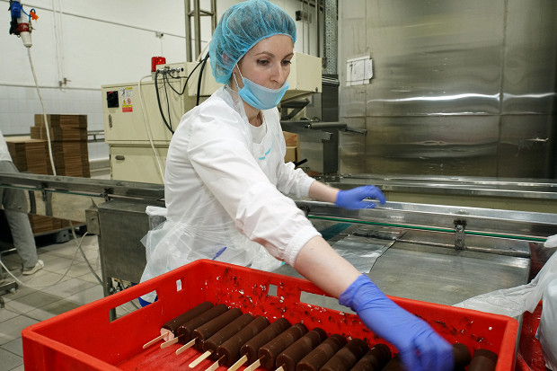 Шоколадное эскимо, глазурь которого моментально высыхает, отправляется на ручную упаковку. Чтобы завернуть мороженое в тонкую фольгу, сотруднице фабрики хватает 3 секунд.