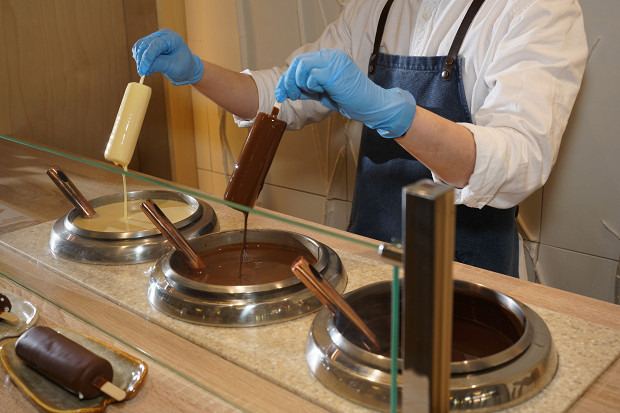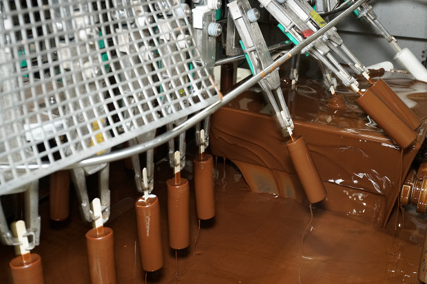 Минут через пятьдесят замороженный при –40 градусах пломбир выезжает на ленту конвейера, где его ждет распределение: одна часть мороженого будет захвачена автоматом и отправится в ванну с шоколадной глазурью. Чтобы помочь роботу беспрепятственно хватать за палочку прилипшее к пластинам мороженое, лента слегка подпрыгивает и мороженое подскакивает. Другая часть, без шоколада предназначена для проекта «О, эскимо!» и она сразу уйдет на автоматическую упаковку. «О, эскимо!» — это название для такого направления: пломбир разводят по точкам продаж (это сеть кафе «Чистая линия» и несколько мобильных точек в московских парках), где на глазах у посетителей его будут окунать в одну из трех возможных глазурей: из белого шоколада, молочного или темного.