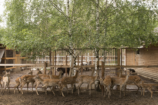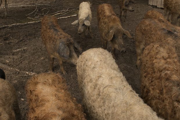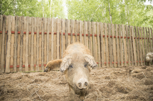 Мы сидим на веранде небольшого деревянного дома, куда пришли из загона, где между берез гуляют рыжие мангалицы — кудрявые, длинношерстные, длинноухие и длиннорылые свиньи. Еще у Дмитрия Хоменко живут яки, вьетнамские свиньи, пятнистые олени, коровы, козы, овцы, куры, утки, цесарки, гуси — ну и так, по мелочи: пума, рысь, кошки, енот, хорьки, мусанги. Хозяин угощает нас душистым чаем, собственноручным паштетом из бараньих потрохов и своими же вареньями из сосновых шишек и черники. Ему чуть за сорок, он в рабоче-повседневной летней одежде: перестиранная футболка с итальянским флагом, спортивные трусы, шлепки на босу ногу. Я спрашиваю его, зачем ему это все вокруг. Он отвечает, уперев руку в бок, а второй опираясь на стойку веранды: