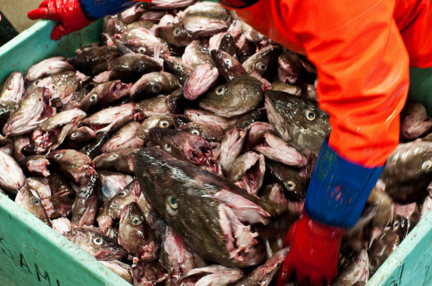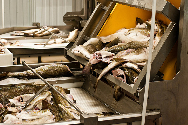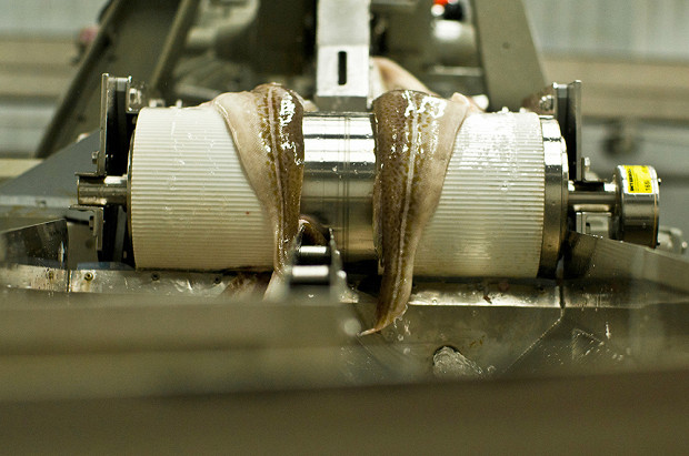 С судов рыба попадает на конвейер, оснащенный датчиками, распознающими ее вес и размер. На этом этапе отсекаются головы (от них затем отдельно отрежут языки и щечки) и плавники.