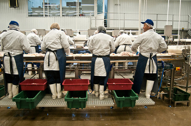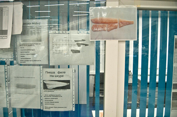 Люди, работающие здесь, получают самые высокие зарплаты на заводе. Что вполне понятно: за рабочую смену в холодном и влажном помещении необходимо проверить сотни кусков филе на соответствие размеру и на наличие паразитов. Для этого у каждого есть стол с контровой подсветкой. Все, что можно разглядеть невооруженным взглядом, удаляется. Риск, что отдельные паразиты останутся в толще тканей есть, но здесь, на фабрике, уверены, что бояться не стоит: все равно при глубокой заморозке или термообработке паразиты погибнут.