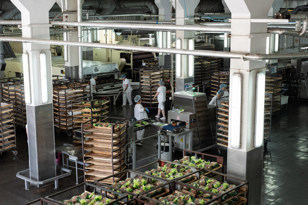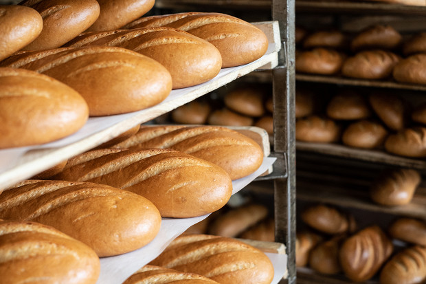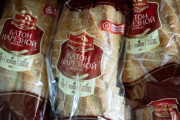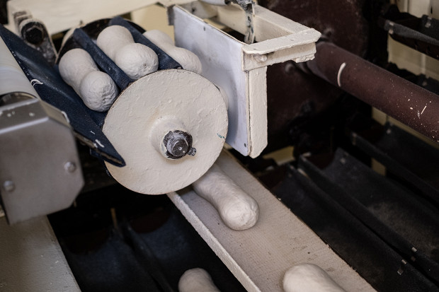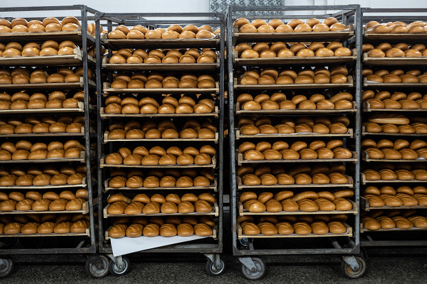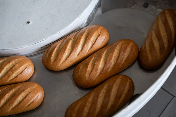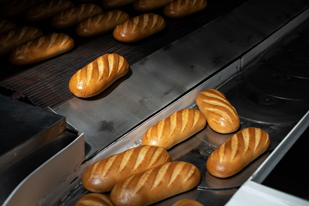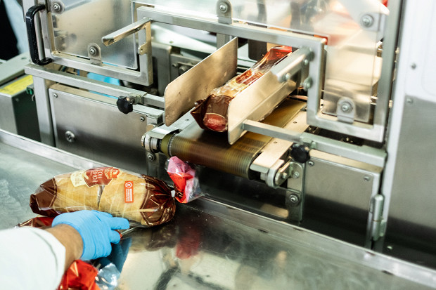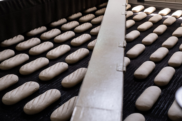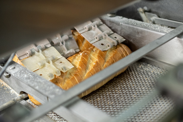 Спустя два часа хлеб оказывается в упаковочно-резальной машине. Сначала батон автоматически режется на куски, а затем по транспортеру уезжает на упаковку, где его засовывают в полипропиленовый пакет. От замеса опары до выхода нарезного батона из печи проходит пять с половиной часов. За сутки цех выпекает 67 400 батонов, производство которых контролируют 20 человек.