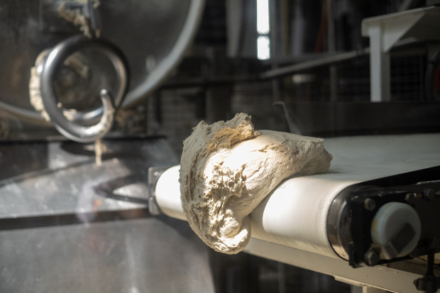 Несмотря на бабушкин метод, сама опарная — полностью автоматизированное жаркое пространство, в котором поддерживается влажность около 80% и температура 25 градусов. Опара — это мука, дрожжевая суспензия и вода. Как только эти три ингредиента соединяются при такой влажности и температуре, начинается брожение, которое длится три с половиной часа. За это время 150-литровая дежа с медленно, но верно созревающей опарой тихо катится по рельсам, проложенным на полу отделения. В середине четвертого часа дежа с уже выбраженной опарой окажется во власти автоматизированного подъемника. Подъемник опрокидывает опару в воронку, расположенную где-то очень высоко, на уровне второго этажа, а уже из воронки она, поделенная на небольшие порции, поступает на транспортерную ленту, и затем — в тестомесильную машину. Замес нового теста происходит каждые 15 минут.